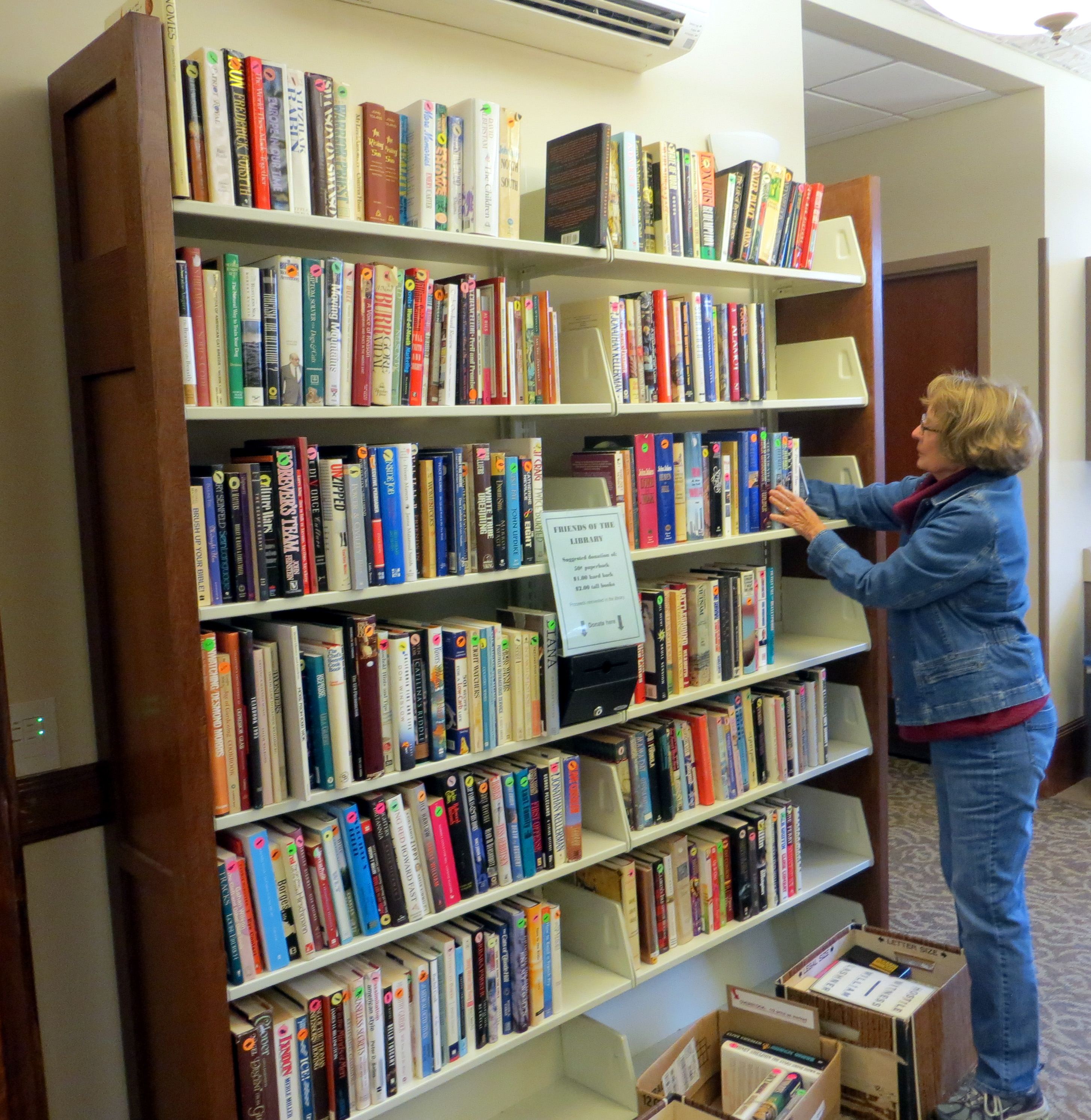 We have doubled our donated books now available for patrons for a modest suggested donation fee. As you walk into the main entrance of the library, look to your right and you will see shelving unit full of fiction and non fiction hard bound books with a “Donation Box” in the middle of one of the shelves. Close by, you will see a wooden unit with paperbacks on top and two pull out drawers also full of paper backs. There is a good range of books with something for every one and we restock the shelves regularly. The picture shows board member Kate Joswick filling the shelves.